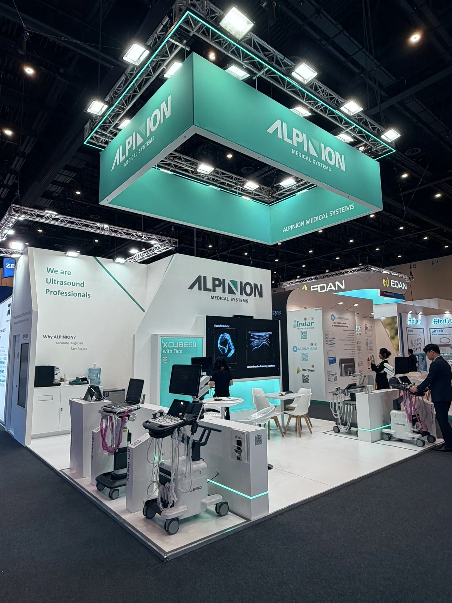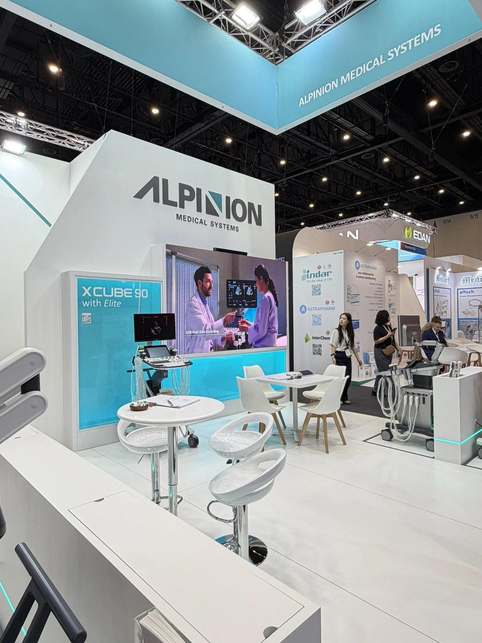 작은 규모의 공간에서도 브랜드의 기술력과 방향성을 직관적으로 전달할 수 있도록, 보이지 않는 초음파 기술을 공간 경험으로 확장했습니다. LED 라인 조명을 활용해 초음파의 흐름과 파장을 시각적으로 표현하고, 공간 전반에 일관된 리듬과 몰입감을 형성합니다. 특히 초음파의 핵심 개념인 ‘보이지 않는 파동’을 빛과 구조로 재해석하여, 관람객이 자연스럽게 브랜드의 기술력을 체감할 수 있도록 구성했습니다. Corporate Color를 중심으로 첨단 의료기기 기업으로서의 신뢰감과 정제된 이미지를 강화하고, 브랜드 아이덴티티가 공간 전반에 일관되게 드러나도록 정리했습니다. 단순한 제품 전시를 넘어, 알피니언이 지향하는 기술 혁신과 미래 의료 환경에 대한 비전을 공간을 통해 전달합니다